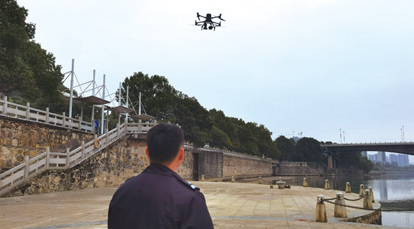 執法人員控制巡檢無人機檢查沿河的非法捕魚活動。“請注意!一人多桿,您已違反禁漁規定,請您立即停止違規垂釣行為!”12月1日下午,一架無人機在河濱起...