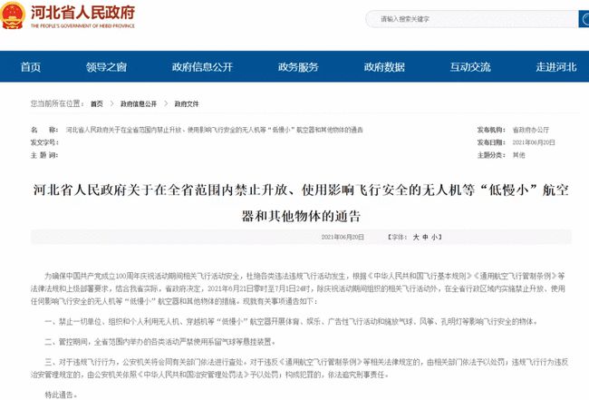 近日,為確保中國(guó)共產(chǎn)黨成立100周年慶祝活動(dòng)期間相關(guān)飛行活動(dòng)安全,杜絕各類違法違規(guī)飛行活動(dòng)發(fā)生,多省市發(fā)布禁飛通告。各位飛行愛(ài)好者需多關(guān)注,合法、安全飛行。河北省政府最新...